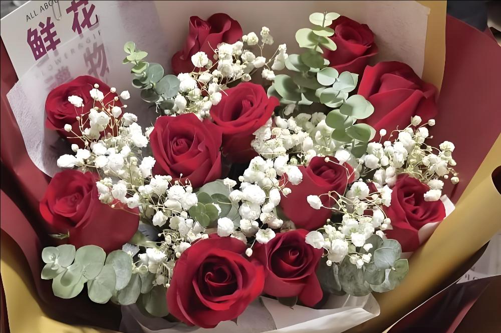 材料:6朵红玫瑰6朵红色康乃馨,6朵香槟玫瑰,3朵粉百合,搭配红豆,尤加利叶,酒红色包装纸扇形包